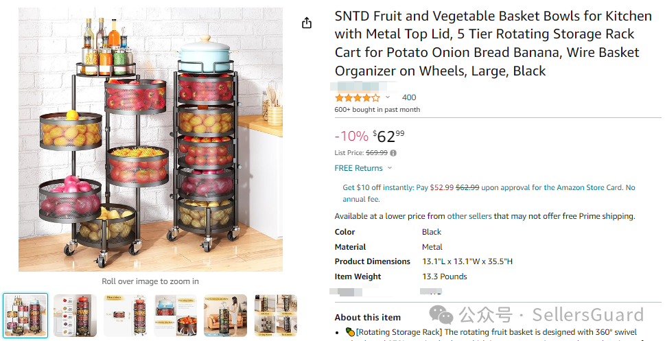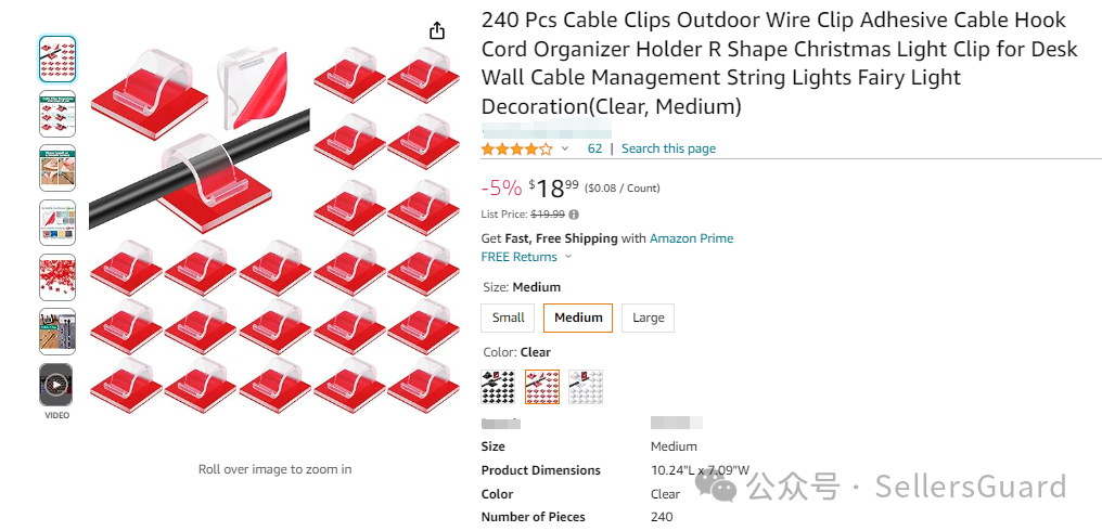 疑似与该外观专利高度相似的亚马逊产品链接截图,售价18.99,已有62个留评: